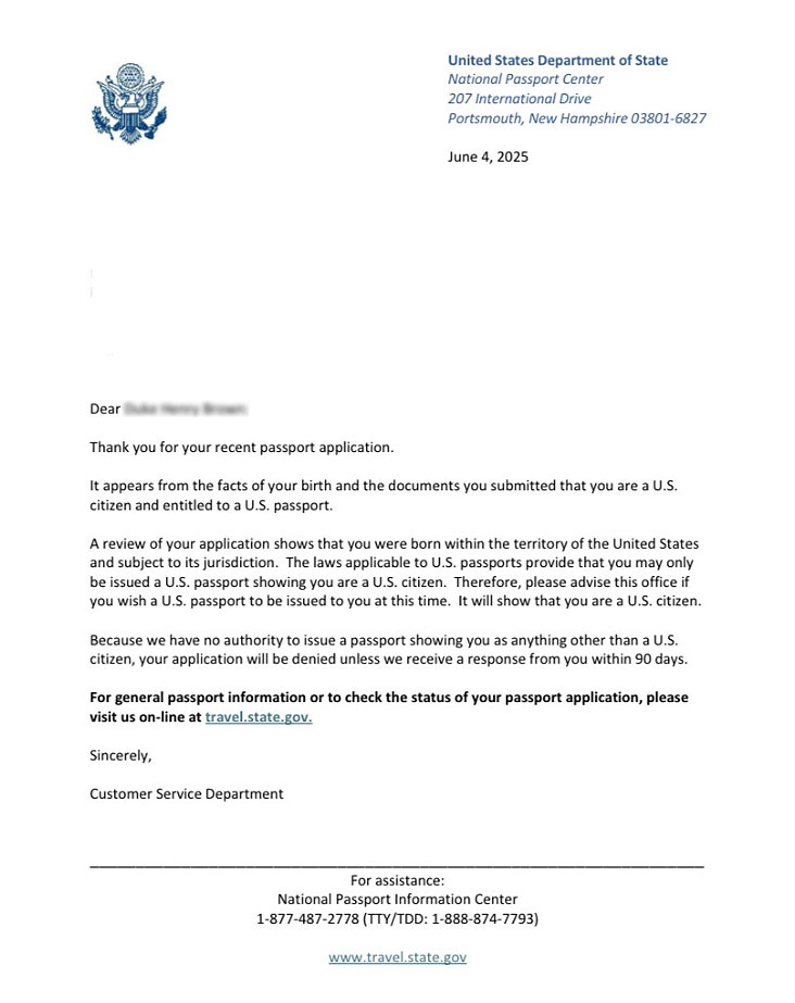 Did you receive a letter from Ms. Kellie N. Robinson? The image below is a copy of her letter. You may receive a letter after submitting your passport application, from a representative named Kellie Robinson. We believe that this is a bluff letter; we have just ignored it as it does not apply to national status. Essentially, it is a distraction. A response, if you choose to reply to this letter, would be to reiterate the definition of a national and reference the INA.